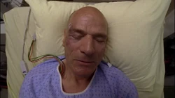 Shawn and Gus follow Oswald's likely trail and discover blood on a rock next to some steps. They also find a pedometer that accurately displays the distance between the steps and the home. They now know he must have fallen there somehow, but since his body is nowhere to be seen they go to the nearest hospital. They disguise themselves as hospital staff and eventually find Oswald because Shawn recognises a tattoo from a picture taken during his younger years that he had seen in his room at Glorious Pines. The two medical residents in Oswald's room, Walker and Ramachandran, explain that he's in a coma, was "admitted two days ago with severe hypotension causing low brain perfusion" and also "suffered intracranial bleed from syncope and falling down." In other words, "his blood pressure went boom and his brain got an owie." They also noticed that his blood pressure didn't immediately rise when they administered fluids, which they conclude probably means that he accidentally took too much of his prazosin before he went running.